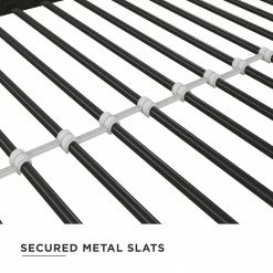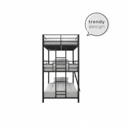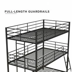 - Built with a strong metal frame that includes secured metal slats, two integrated ladders and full-length guardrails on the top two bunks.