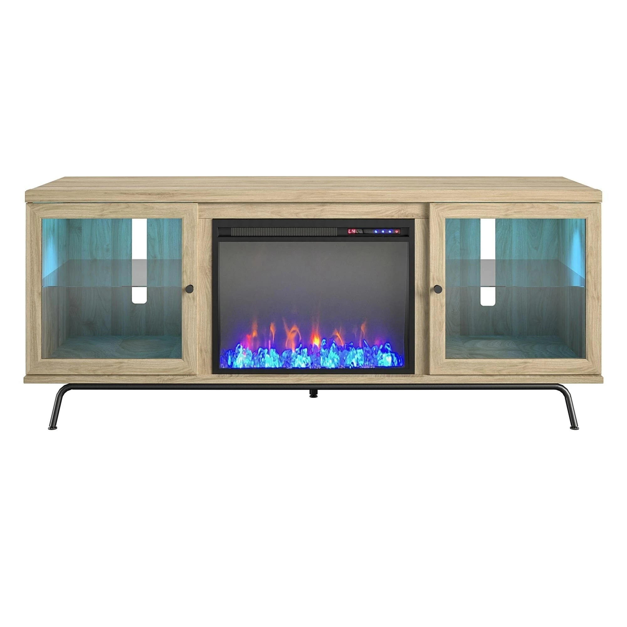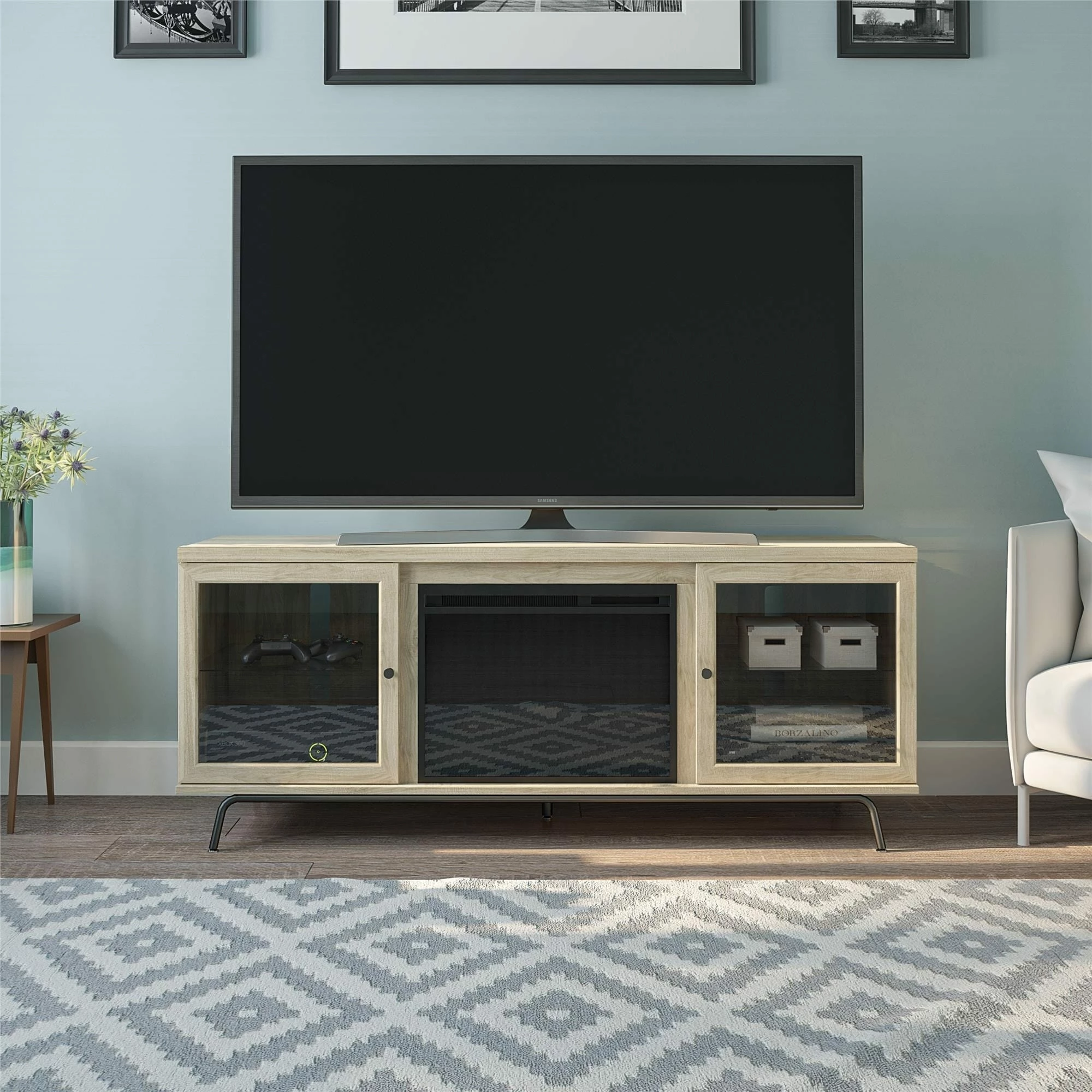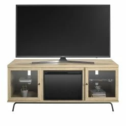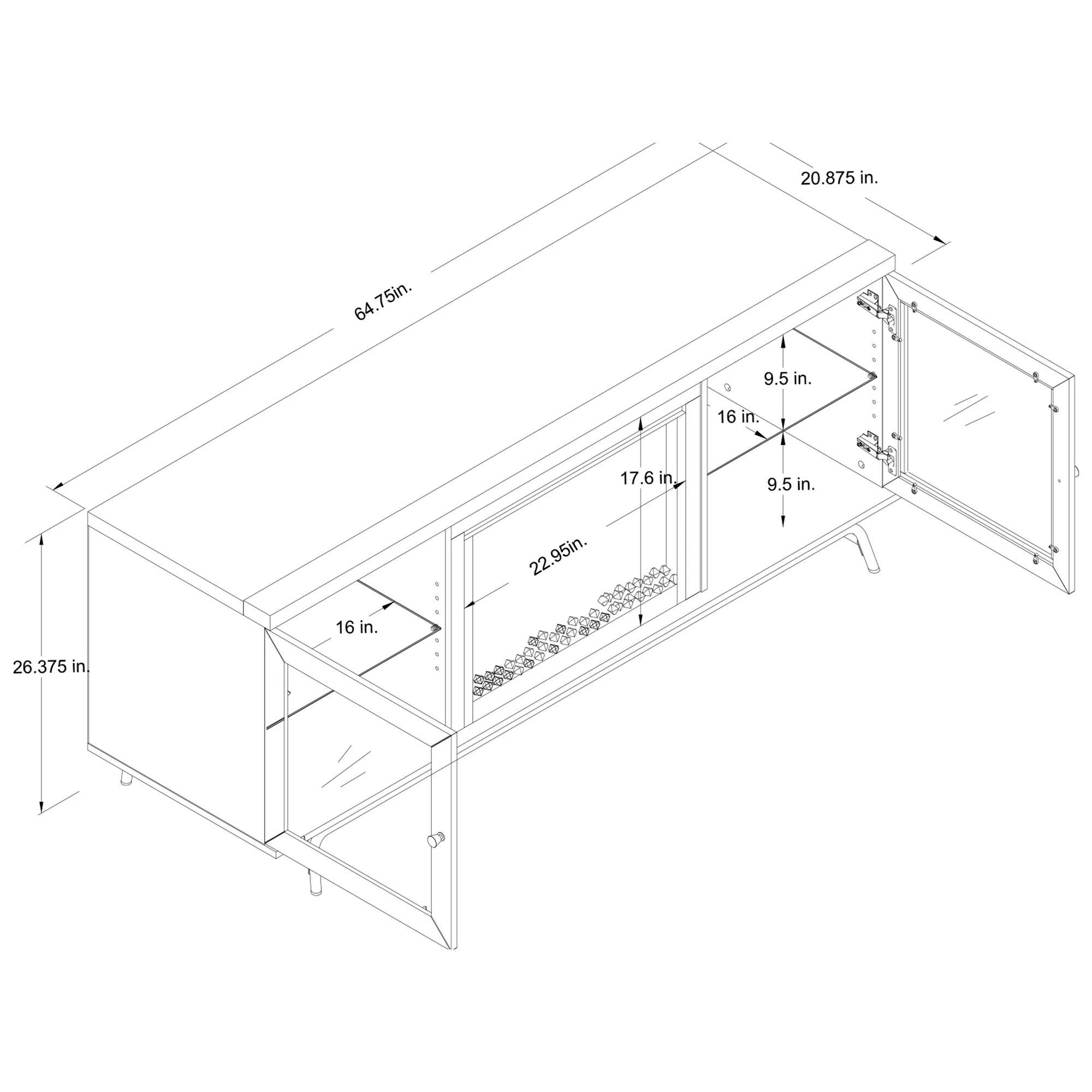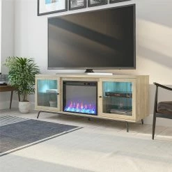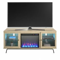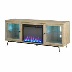 Add a fun retro vibe to your living room with the Avenue Greene Riverside Fireplace TV Stand. This trendy TV Stand can accommodate most TVs up to 70″ wide and up to 120 lbs. The woodgrain finish on the laminated MDF and particleboard pairs with the metal base and glass shelving for a mix of rustic and modern design. The 23″ electric fireplace insert enhances the modern feel with a realistic flame effect that pairs with the LED lighting of the side cabinets. The flames and LED lights can change colors to match your mood. The flames can be used with or without heat so you can enjoy the ambiance even in the summer. Adjust the various flame and heat settings with the remote control or touch panel so your room is always comfortable. The insert plugs into a standard 120V outlet and heats a room up to 400 square feet. Behind each of the 2 glass doors are 2 shelves, 1 glass, to organize your audio and video components and DVDs. The wire management holes make it easy to plug in all of your devices. The Fireplace TV Stand ships flat to your door and requires assembly upon opening. Two adults are recommended to assemble. Once assembled, the TV Stand measures to be 26.375″H x 64.76″W x 20.875″D.