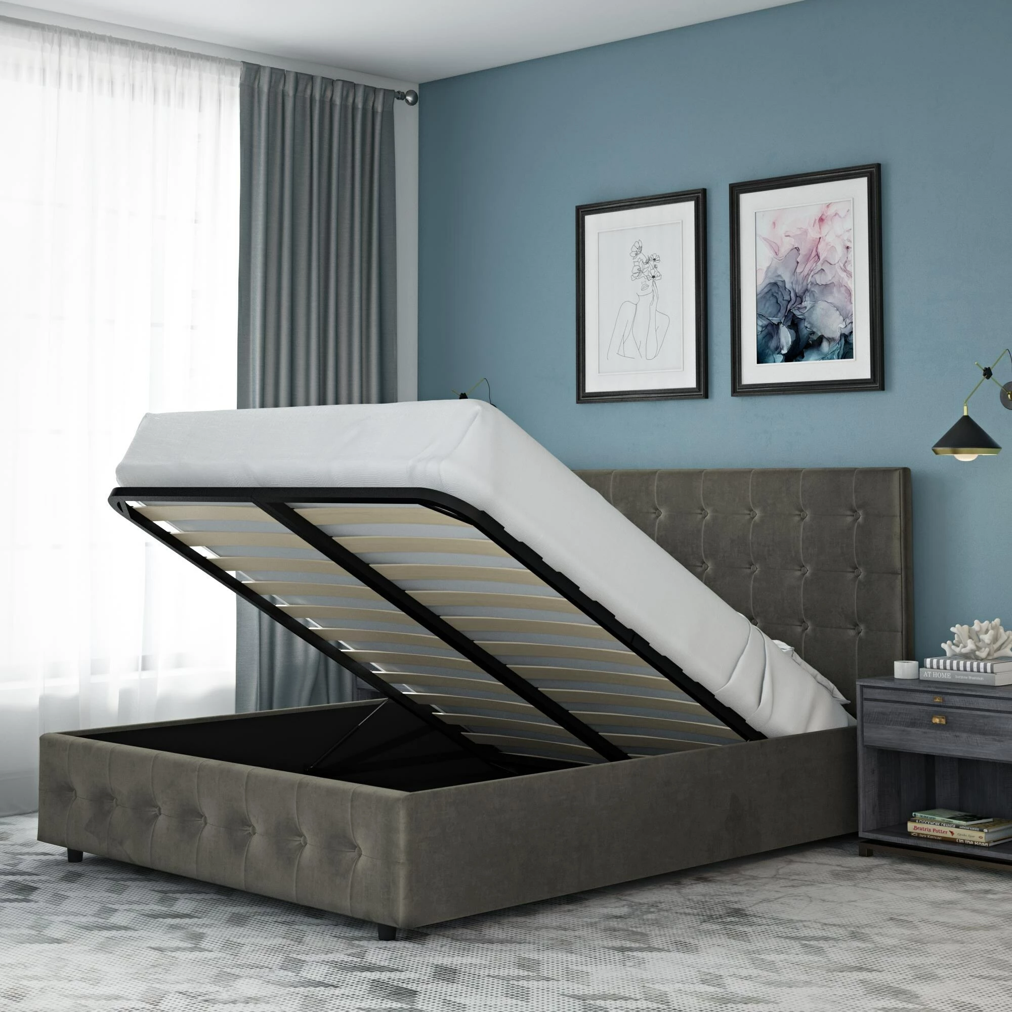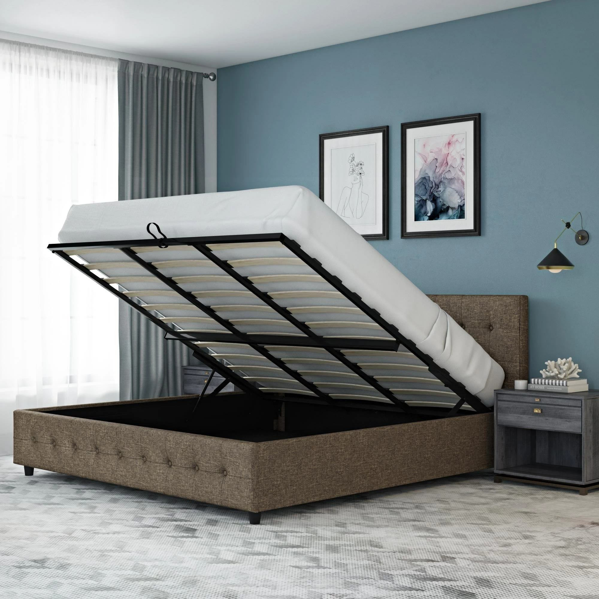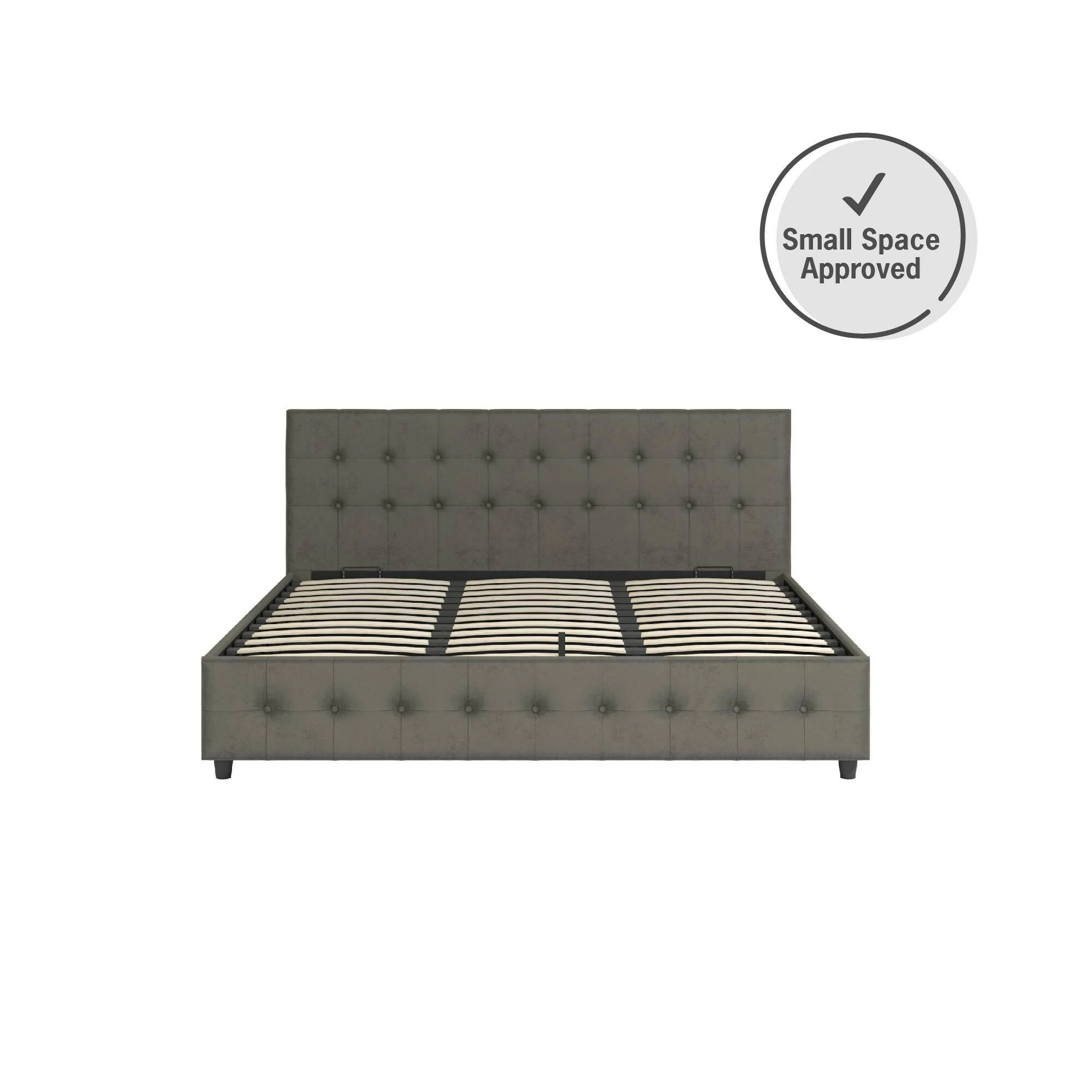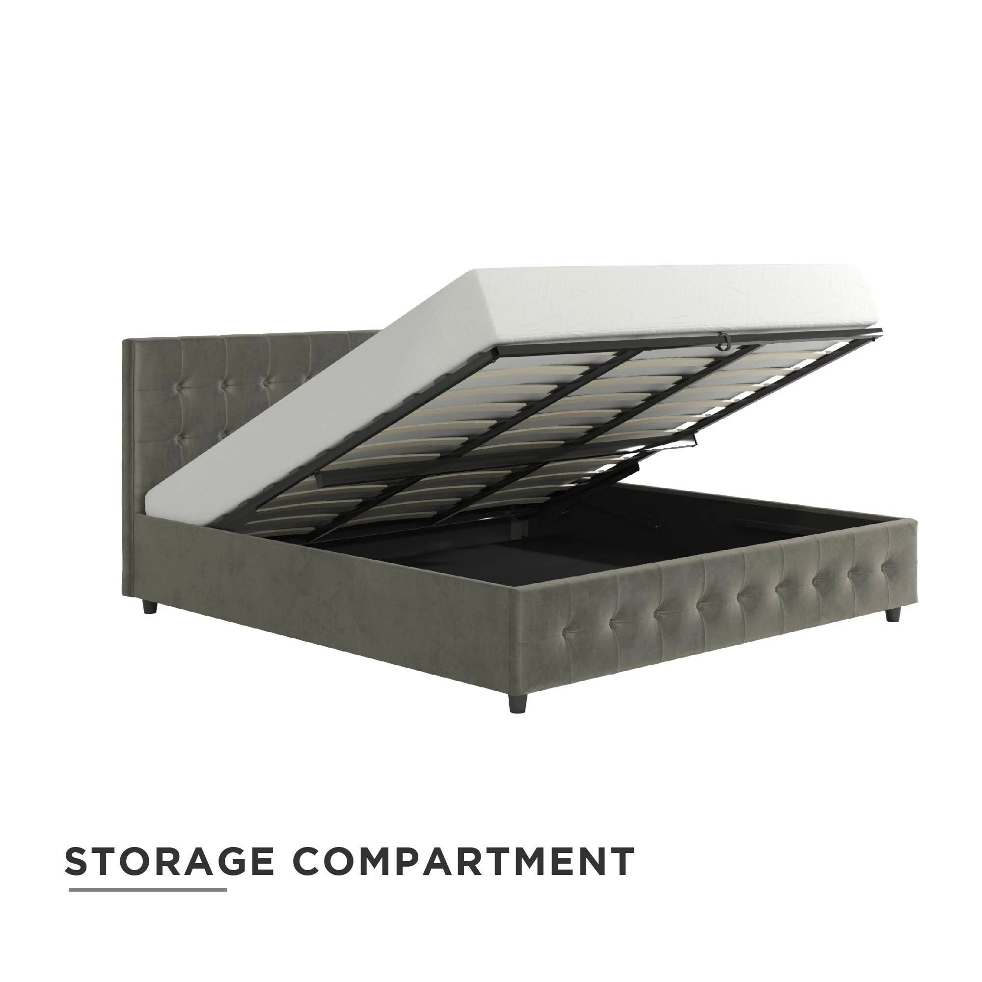 - Large storage compartment under slats that uses gas lift mechanism to lift open