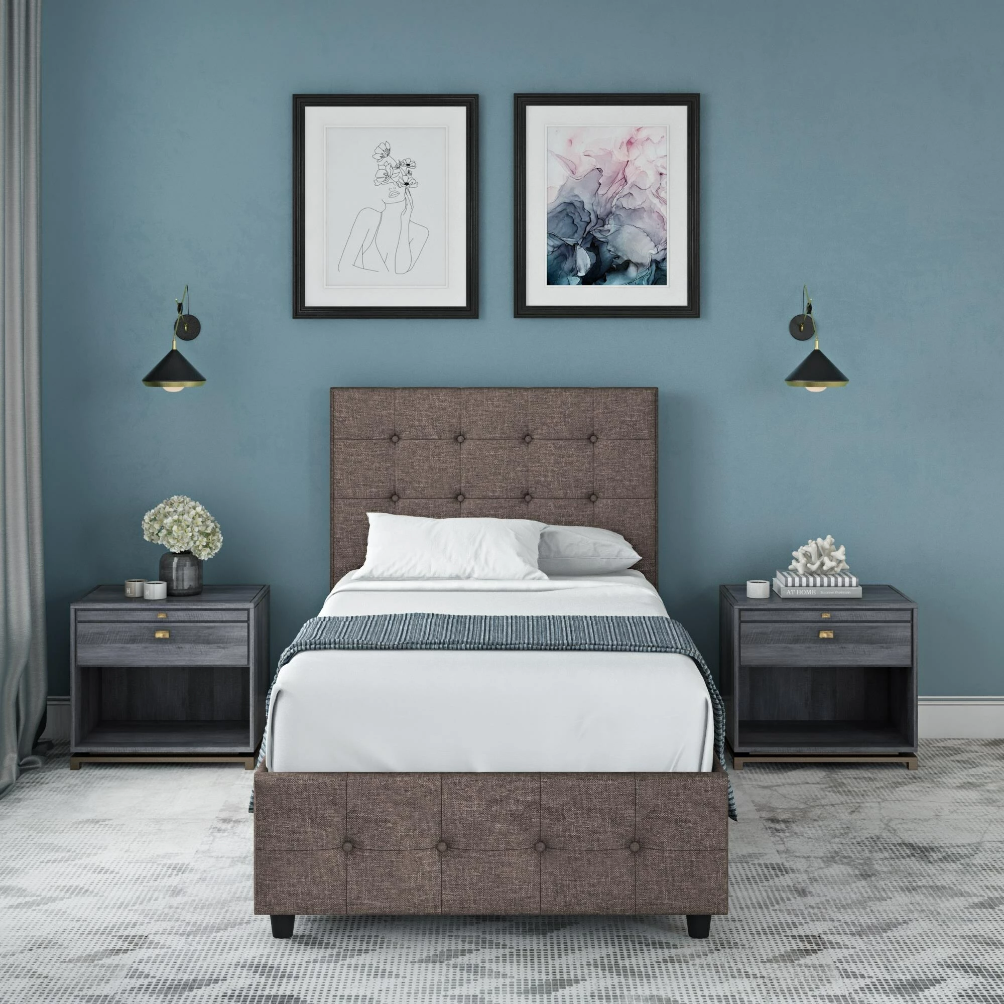 - Available with velvet, linen, or faux leather upholstery in multiple color options