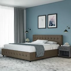 Complete your contemporary bedroom with this vogue platform bed from Avenue Greene. This bed features a slat system to support your mattress, and the foundation lifts up with a gas-lift mechanism to reveal a hidden storage space. The bed comes upholstered in your choice of linen, velvet, or faux leather.