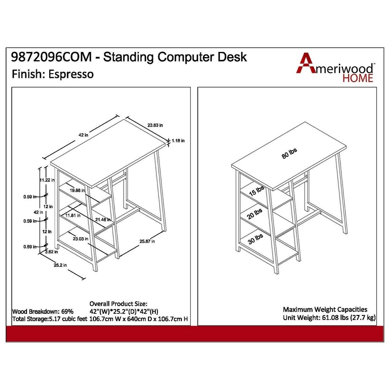 The Avenue Greene Tilton Standing Computer Desk will add the perfect finishing touch to your home office. Take a step outside the box and complete your work from a standing desk. The sturdy metal frame and laminated particleboard desk surface and shelves gives this desk a clean, industrial feel for your home office. Stand up to work on your project then later give your feet a break and pull up a tall chair – it’s the best of both worlds. Desk is 42″ tall. This beautiful desk features 3 open shelves angled to create an A-frame look and is perfect for storing books, notepads, and paper. The Tilton Standing Desk ships flat to your door and requires assembly upon delivery. Two adults are recommended for assembly. The Desk surface can hold up to 80 lbs. and the top, middle and bottom shelf hold 15 lbs., 20 lbs., and 30 lbs. accordingly. After assembly, the Tilton Standing Desk measures to be 42″H x 42″W x 25.2″D.