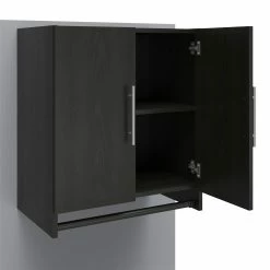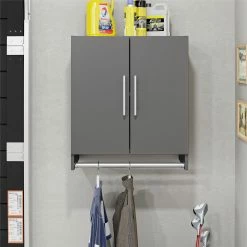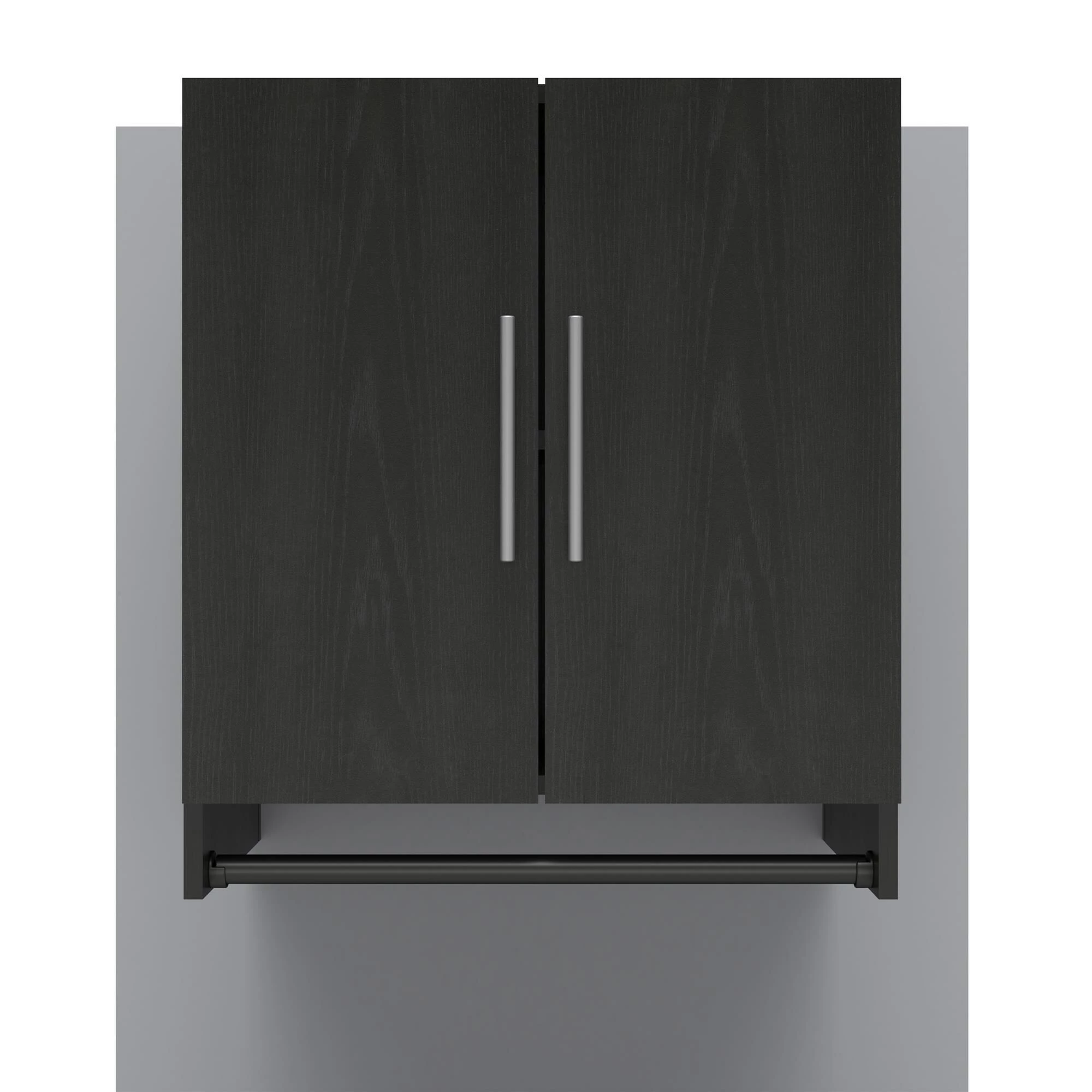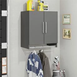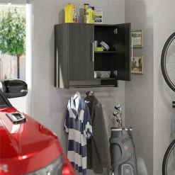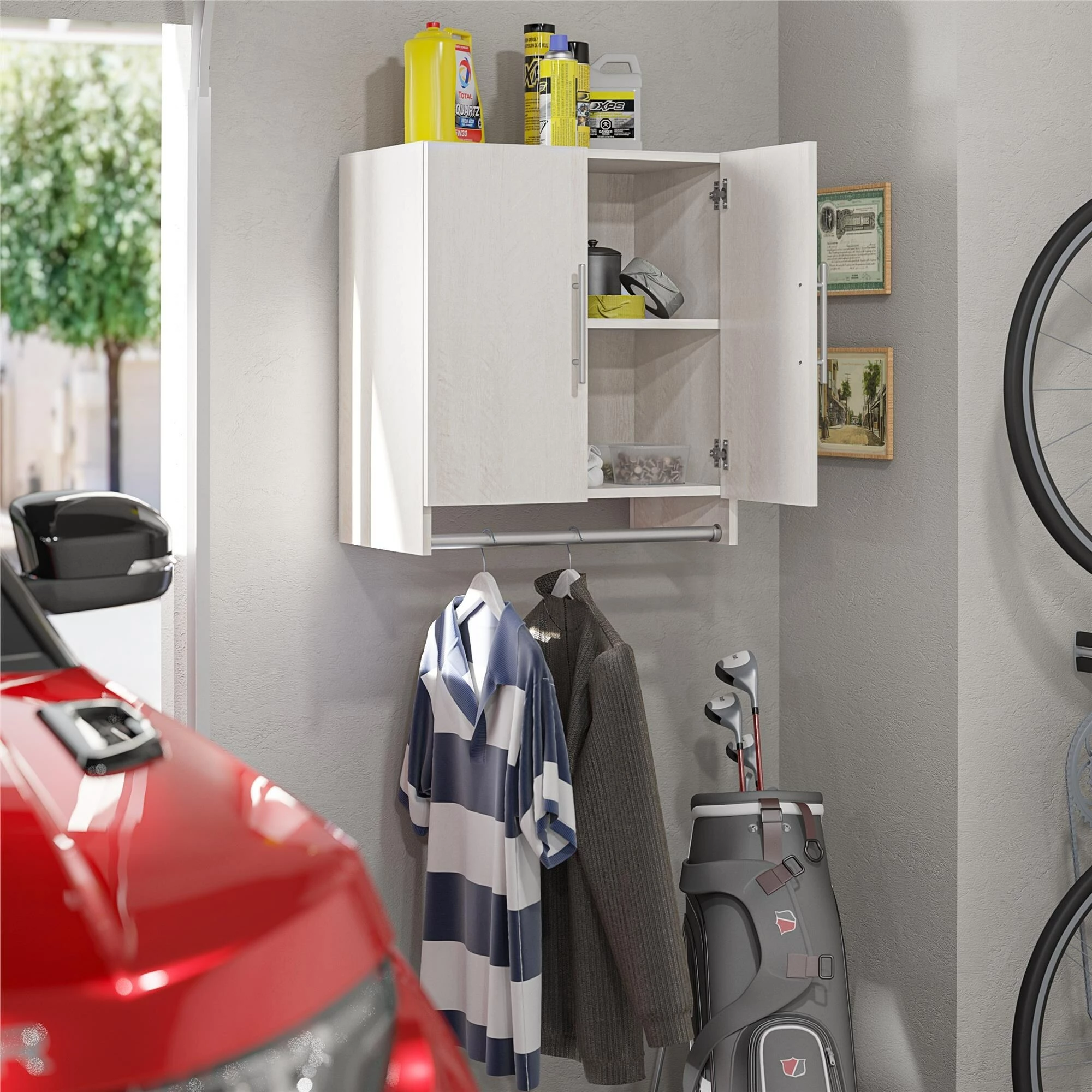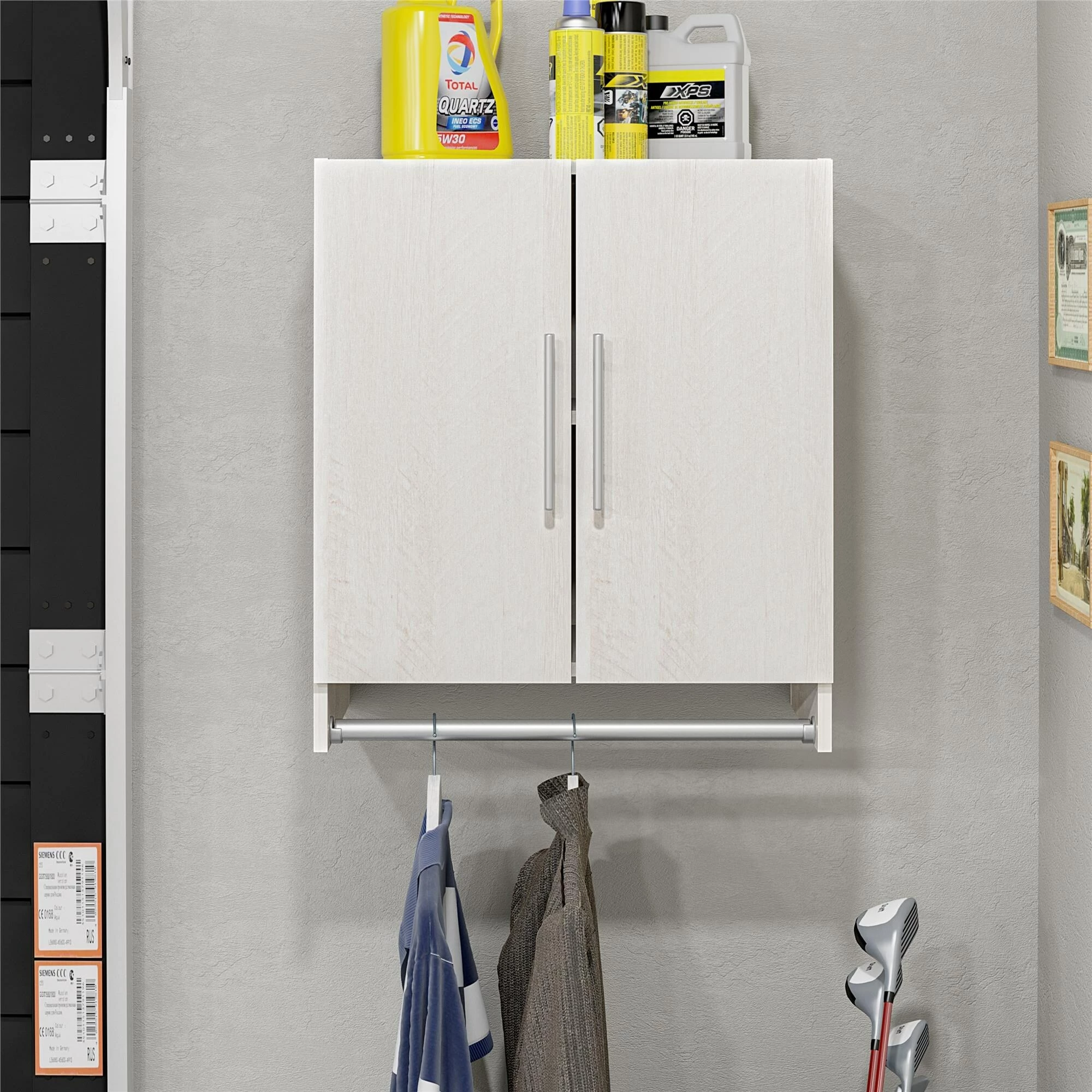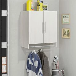 Convert unused wall space into storage with the Avenue Greene Wardlaw 2 Door Wall Cabinet with Hanging Rod. Made of laminated MDF and particleboard, this sturdy storage solution is sure to get you organized. Use the concealed storage of the Wall Cabinet for laundry essentials and cleaning supplies, and hang your cares out to dry on the convenient built in clothing rod below. The interior of each of the 2 Cabinets features 1 adjustable and 1 fixed shelf. The EZ Hang system makes hanging the Wall Cabinet quick and easy. Simply attach and level the support bar on the wall and hook the Wall Cabinet on for a sturdy and level hang on the first try. Use this piece as a stand-alone item, or combine it with additional Avenue Greene Wardlaw storage items to create the perfect storage solution for your home. The Wall Cabinet ships flat to your door and requires assembly. Two adults are recommended to assemble. Once assembled, the Wall Cabinet measures to be 23.46″W x 15.35″D x 26.93″H.