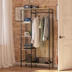 Create extra closet space anywhere or neatly organize your current closet with the Avenue Greene Wardlaw Open Wardrobe. ย Perfect for tucking away out of sight, but stylish enough to place anywhere in your home, the Wardlaw Open Wardrobe features a bar for hanging clothes, and five spacious shelves for shoes, boxes or bins. ย Place in a mudroom or entryway for coats and kids’ school items or hang your seasonal clothes neatly on the rack to keep them unwrinkled and ready to go when you are. ย The Open Wardrobe is a great solution for small homes or college dorm rooms where closet storage is limited. ย The wardrobe is made from metal and durable engineered wood and ships flat to your door in one box. ย Some assembly required. ย Assembled dimensions: 70.84″H x 37.4″W x 15.75″Dย