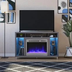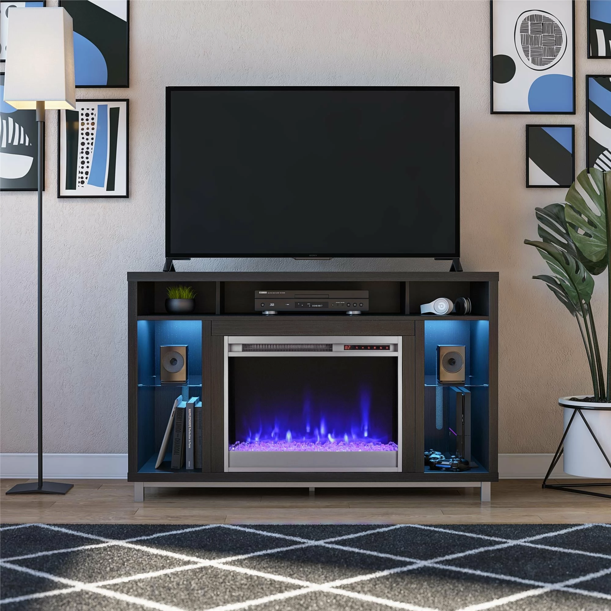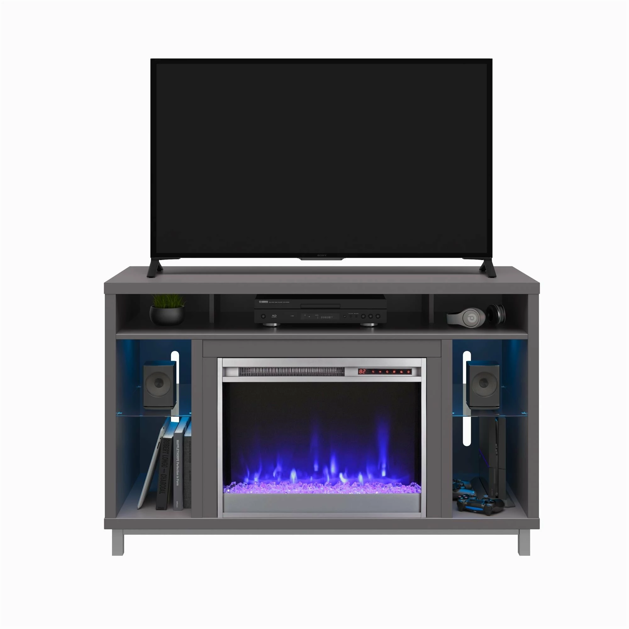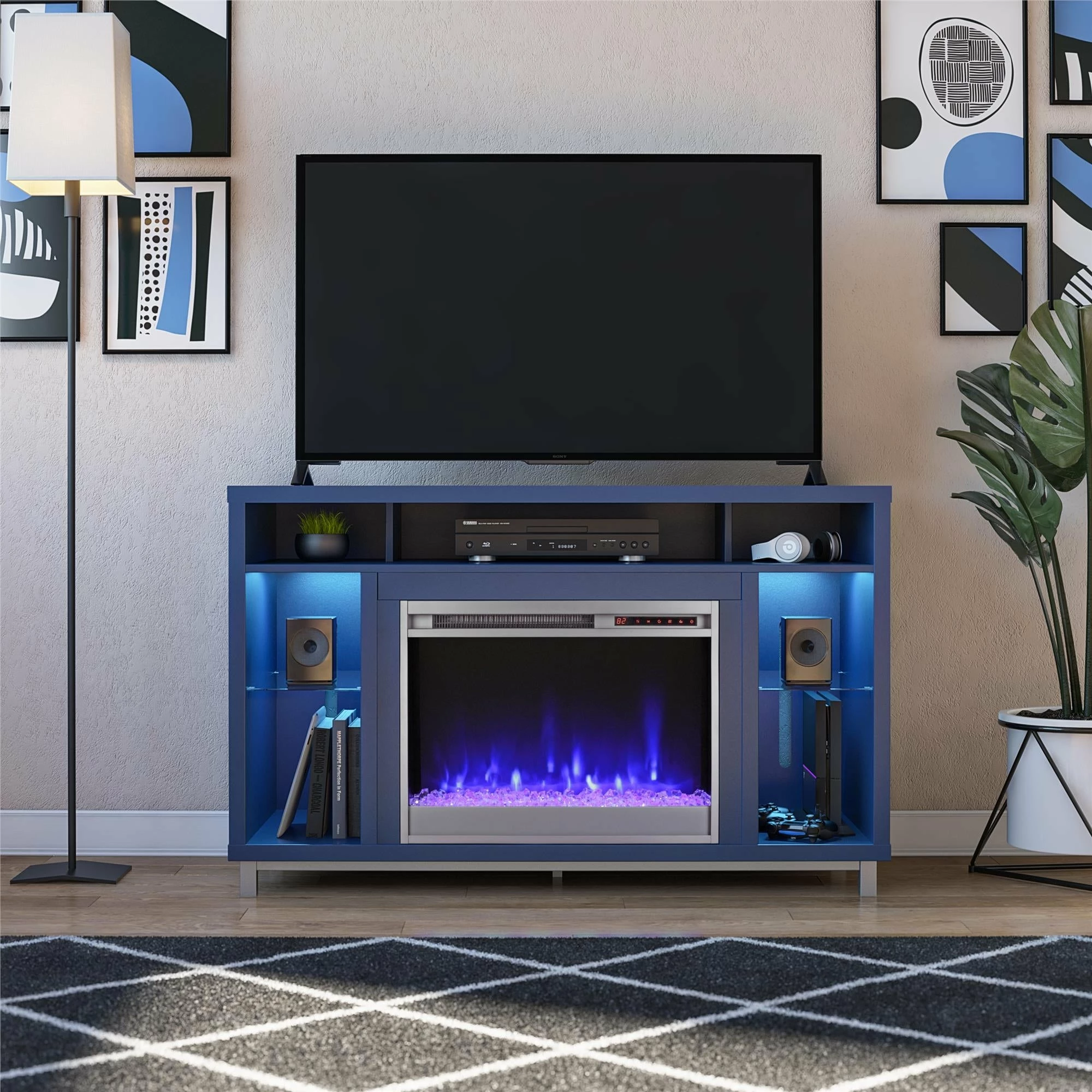 - With 5 open shelves for audio components, DVDs, Blu-Rays, or video games, this stand can store everything you need for movie night while giving you the ambiance of a fire with the touch of a remote. Shelves illuminate in a blue color that can be turned off or on
