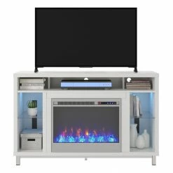 Step away from the ordinary and give your living room a modern makeover with the Avenue Greene Westwood Fireplace TV Stand. ย Donโt let the simple look fool you, this stand comes with a 23โ electric fireplace insert with all the bells and whistles. Ready to warm up a 400 square foot room with the touch of a button, you can relax knowing that timers will take care of the rest. If you want to simply enjoy the look of the flames without the heat, use the included remote to switch off the heat option and pick your flame brightness. The fun doesnโt stop there though. On either side of the fireplace insert are 4 shelves, 2 glass, that hold your entertainment components like gaming systems, a DVD player, DVDs and more. Both of the side shelves are illuminated with lights to coordinate with the glowing fireplace. These lights can be turned off if you prefer not to have them on. The top divided shelf is ideal for your audio and video equipment. This Fireplace TV Stand has a mix of laminated particleboard and MDF construction with metal feet and tempered glass shelving. Combined together this Stand makes for a very sturdy addition to your room. The top can hold up to a 48โ flat paneled TV with a maximum weight of 80 lbs. Two adults are recommended to assemble this Fireplace TV Stand.