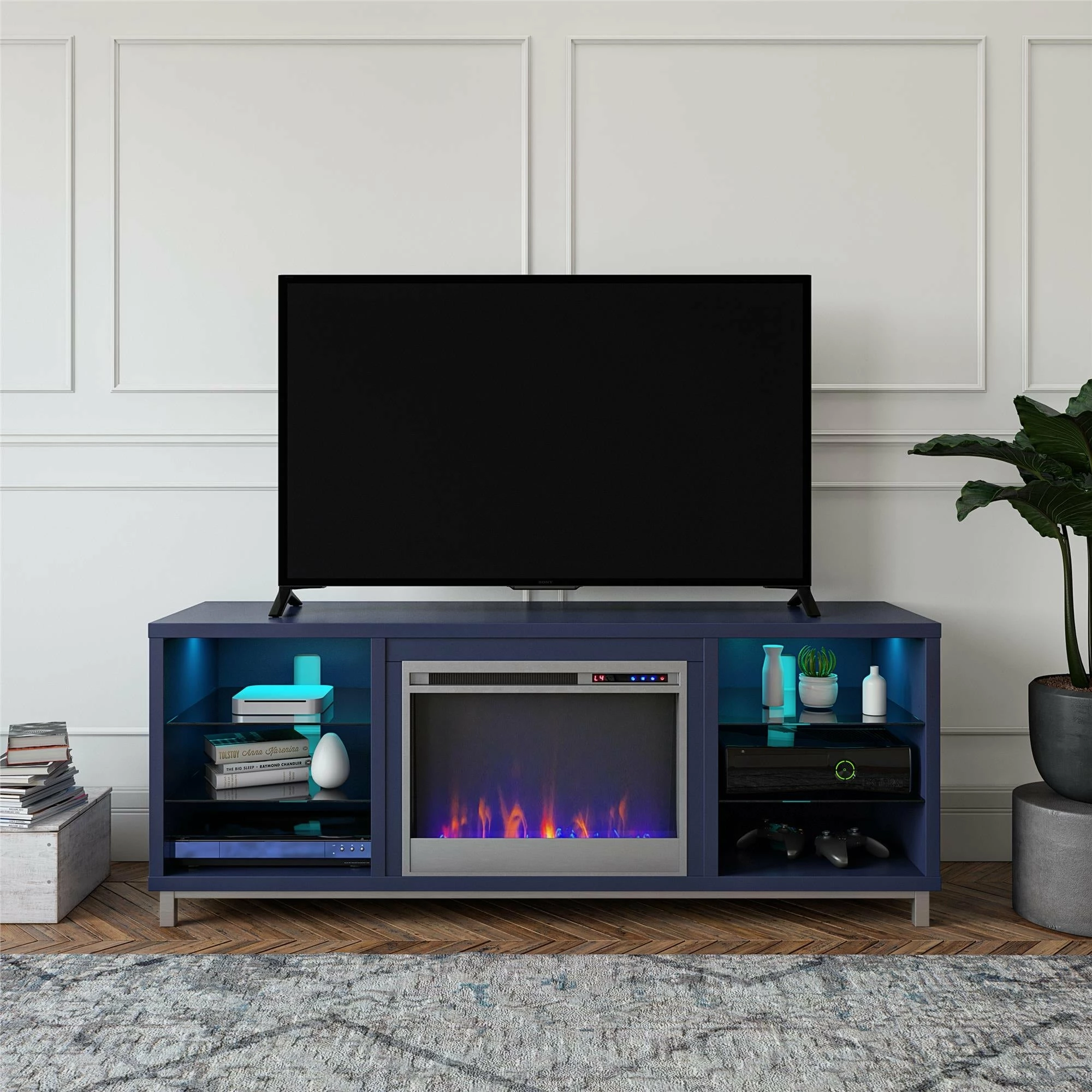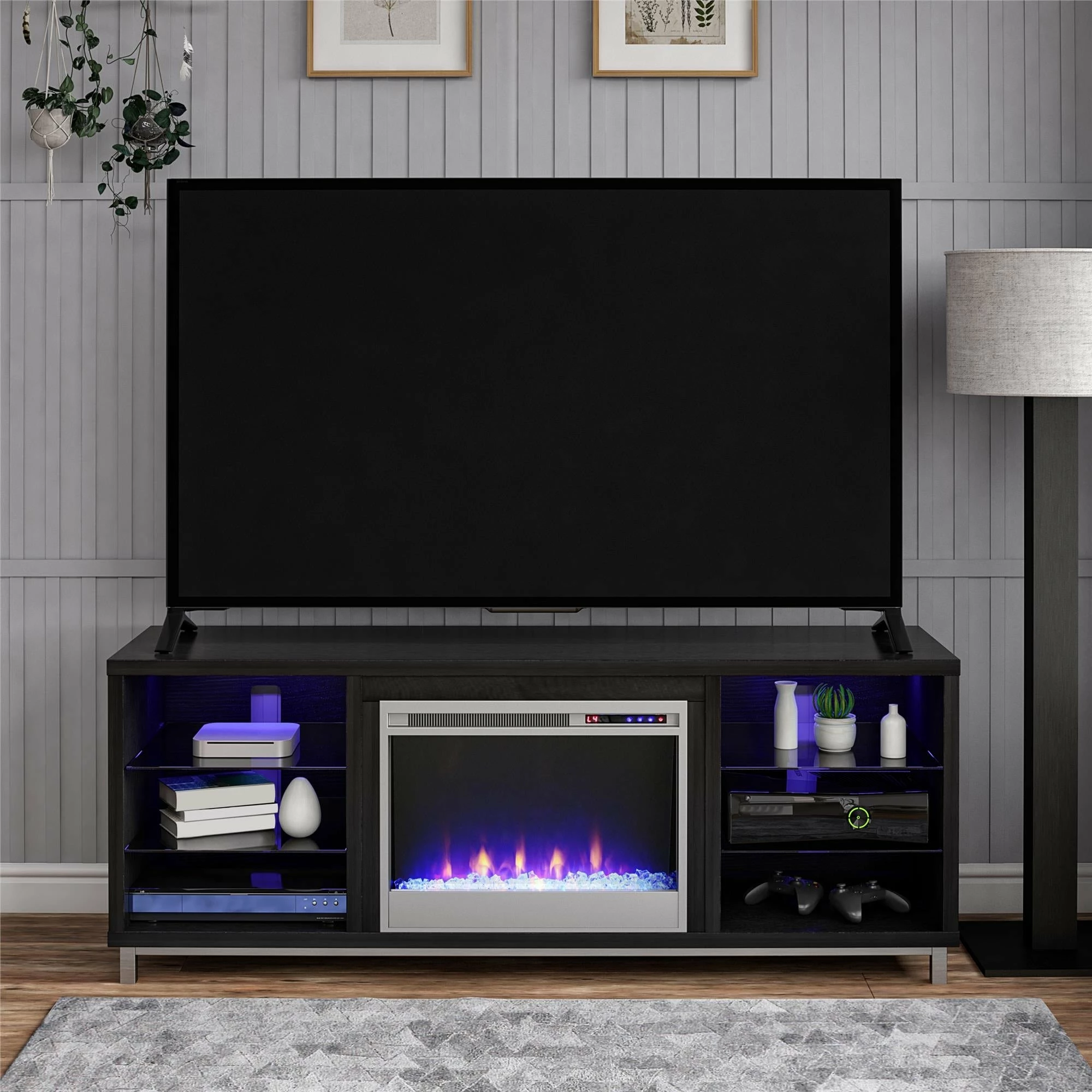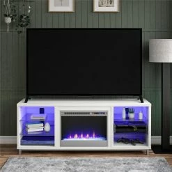 - With 6 open shelves for audio components, DVDs, Blu-Rays, or video games, this stand can store everything you need for movie night while giving you the ambiance of a fire with the touch of a remote. Shelves illuminate in colors that coordinates with the glowing flames