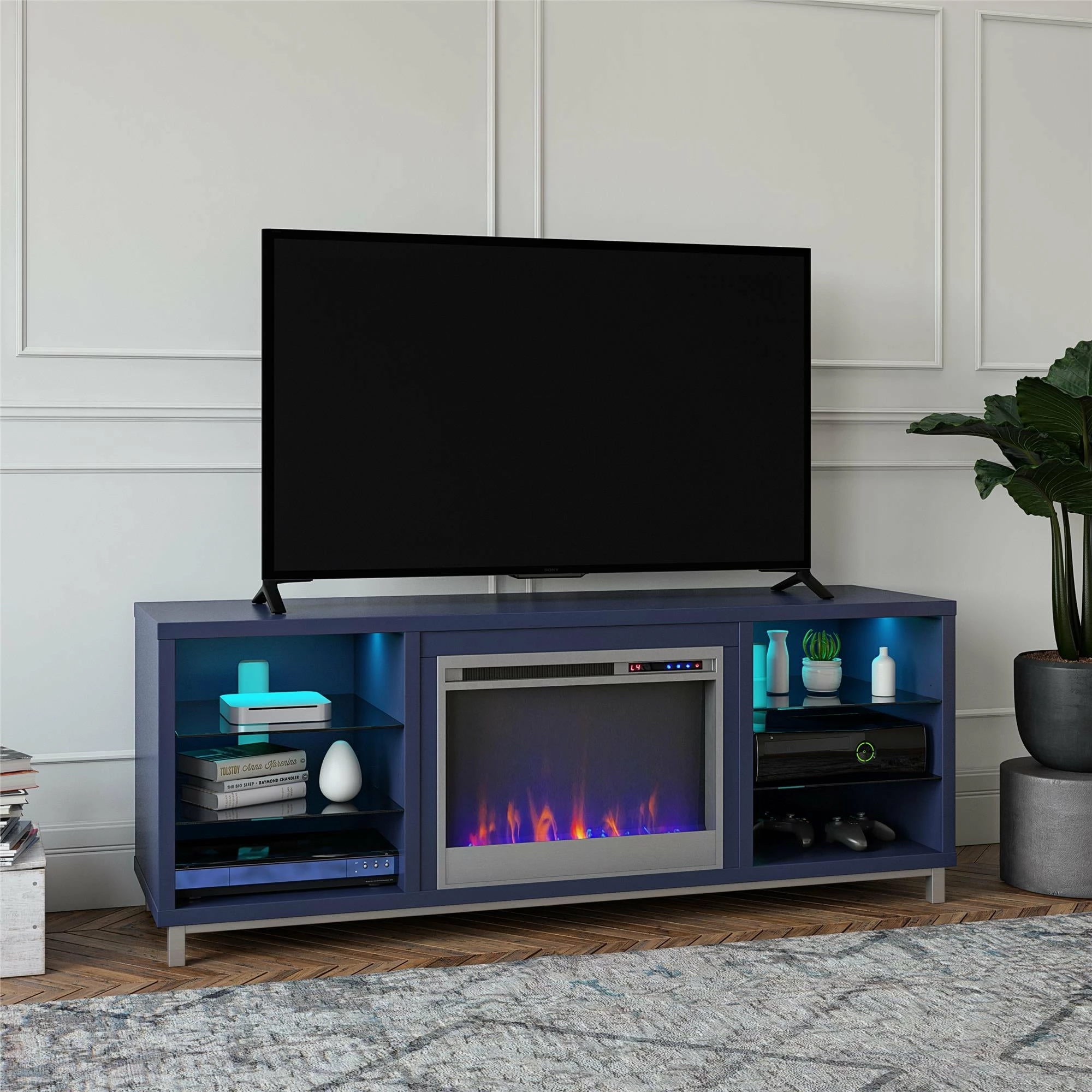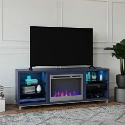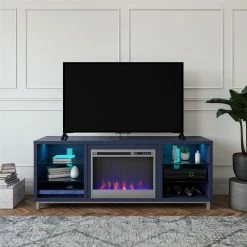Step away from the ordinary and give your living room a modern makeover with the Avenue Greene Westwood Fireplace TV Stand. Don’t let the simple look fool you, this stand comes with a 23” electric fireplace insert with all the bells and whistles. Ready to warm up a 400 square foot room with the touch of a button, you can relax knowing that timers will take care of the rest. If you want to simply enjoy the look of the flames without the heat use the included remote to switch off the heat option and pick your flame brightness. The fun doesn’t stop there though. On either side of the fireplace insert are three shelves, 2 glass, that hold your entertainment components like gaming systems, a DVD player, remotes and more. Both of the side shelves are illuminated with lights to coordinate with the glowing fireplace. This Fireplace TV Stand has a mix of laminated particleboard, MDF and hollow core construction with metal feet and tempered glass shelving. Combined together this stand makes for a very sturdy addition to your room. The top can hold up to a 70” flat paneled TV with a maximum weight of 120 lbs. Two adults are recommended to assemble this Fireplace TV Stand. After assembly, the stand measures to be 24.875”H x 64.75”W x 18.875”D.